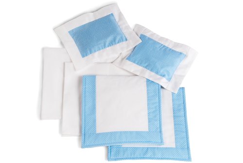 - Sky blue is highlighted with white dots and alternated with white accents for pillowcase, comforter, mattress cover and bed skirt
