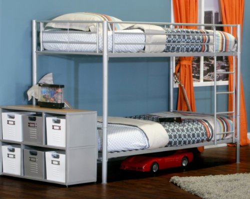 In a versatile silver finish for boys or girls and constructed with metal slats and 1.2 gauge steel. It's a great value and is easy to assemble! Features: Perfect for boysTwin over twin 1.2 gauge steel With Built-In LadderMetal slats Durable steel frame Sleek steel finish Mattresses not included Specifications: Overall dimensions: 60.5" H x 78" W x 42" D Weight: 98 lbsBest option Elite Products Twin over Twin Bunk Bed in Sleek Steel Finish Specification